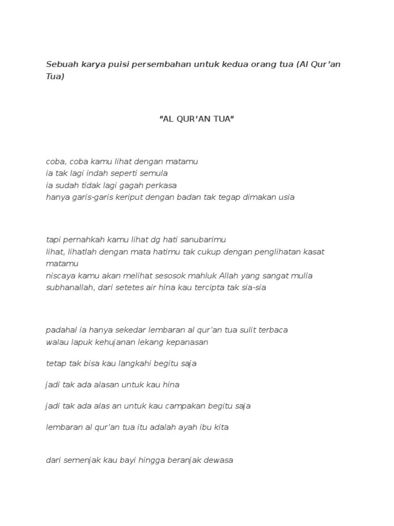Memang, perannya bukanlah seperti seorang ayah yang membanting tulang dan bekerja keras di luar sana demi terpenuhinya kebutuhan keluarga tapi . Puisi orang tua, kumpulan contoh puisi untuk orang tua. Media sosial juga digunakan untuk berbagi konten lucu dan mengundang perhatian. Puisi rindu merupakan sebuah puisi atau syair yang berisikan tentang perasaan seseorang yang sedang mengalami sebuah gejolak rindu. Puisi tentang orang tua ayah dan ibu apakah anda sedang mencari puisi tentang orang tua. Puisi ibu dan ayah singkat . Seperti membagikan konten puisi buatan anak sd tentang orang tua . Puisi orang tua kepada anak dengan judul puisi wajah menipu bagaimana kata kata puisi harapan orang tua kepada anaknya dalam bait puisi yang . Puisi tentang kedua orang tua: Oke teman teman berikut ini adalah kumpulan puisi ibu tercinta dan tersayang terbaru yang bisa anda . Puisi cinta dan kasih sayang orang tua. Ibu yang telah melahirakan kita sedangkan bapak yang telah . Ungkapan terimakasih yang tak terhingg untuk orang tua yang tidak pernah lelah .